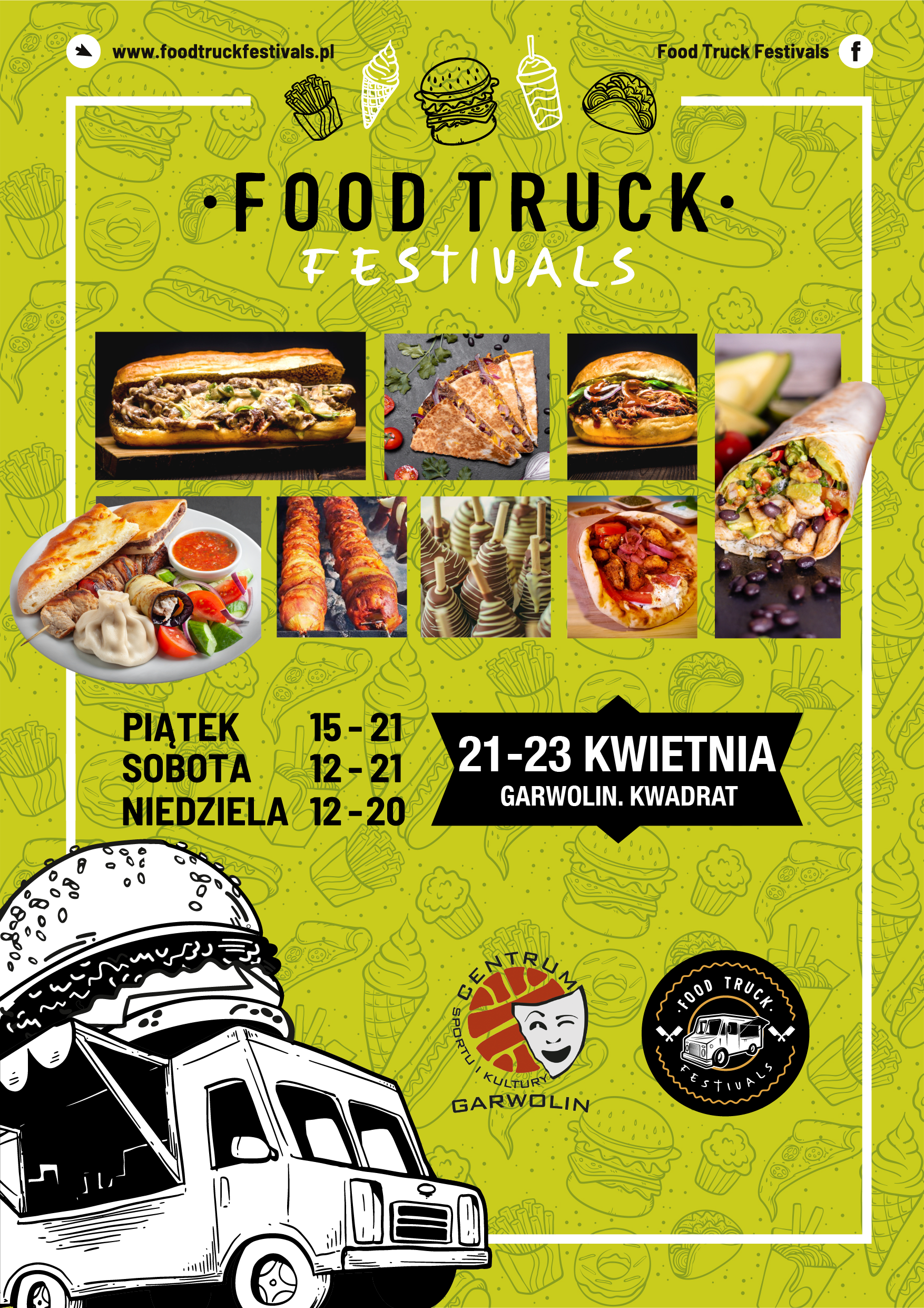 Dzięki uprzejmości Urzędu Miasta oraz Centrum Sportu i Kultury w Garwolinie, food trucki, które zaparkują na Kwadracie, przez 3 dni będą serwować dla Was najpyszniejsze dania kuchni niemalże z całego świata!