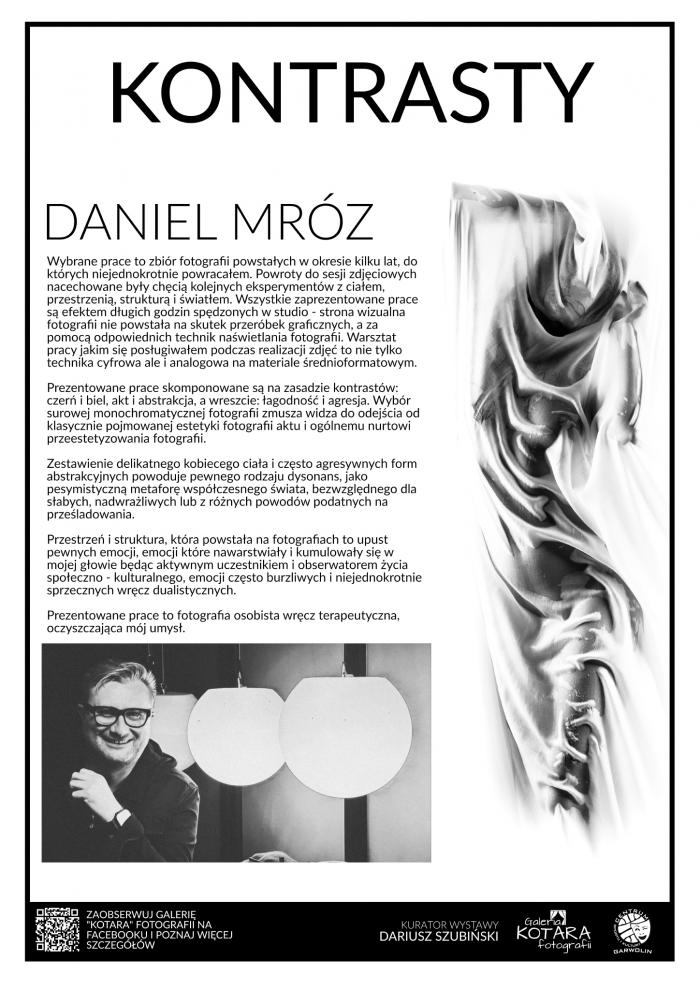 Jeszcze przed świętami w przestrzeni ekspozycyjnej holu dolnego pojawiły się fotografie Daniela Mroza. Zgromadzone prace powstawały przez kilka lat; autor wielokrotnie do nich wracał, pracując nad kadrem i formą. Eksperymentował z ciałem, przestrzenią, strukturą i światłem, budując kolejne warianty ujęć. Wszystkie pokazane fotografie są rezultatem długich godzin spędzonych w studio. Wizualny efekt nie jest skutkiem cyfrowych przeróbek, ale pracy z aparatem i światłem – odpowiednio dobranymi technikami naświetlania. Mróz korzystał zarówno z techniki cyfrowej, jak i analogowej, na materiale średnioformatowym.
