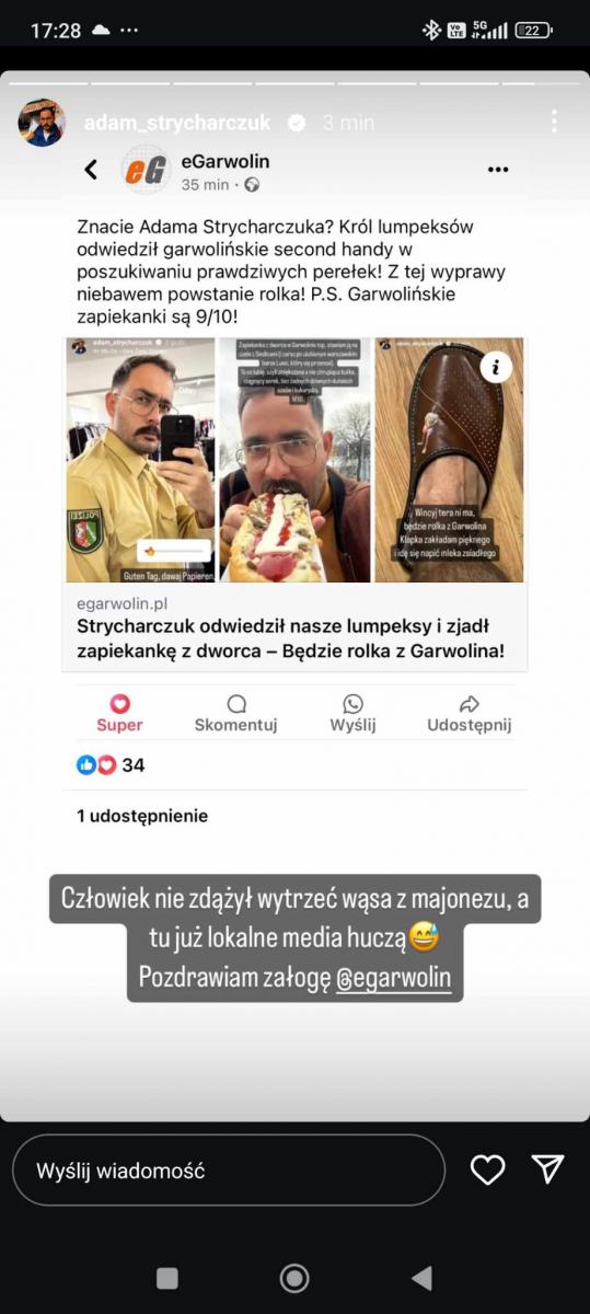 Znawca lumpeksów, ale i zapiekanek, docenił smak garwolińskiego przysmaku. - Zapiekanka z dworca w Garwolinie top, stawiam ją na czele z Siedlcami (i zaraz po ulubionym warszawskim barze Lussi, który się przenosi). To co lubię, czyli zmiękczona a nie chrupiąca bułka, ciągnący serek, bez żadnych dziwnych duńskich sosów i kukurydzy. 9/10 - relacjonował.