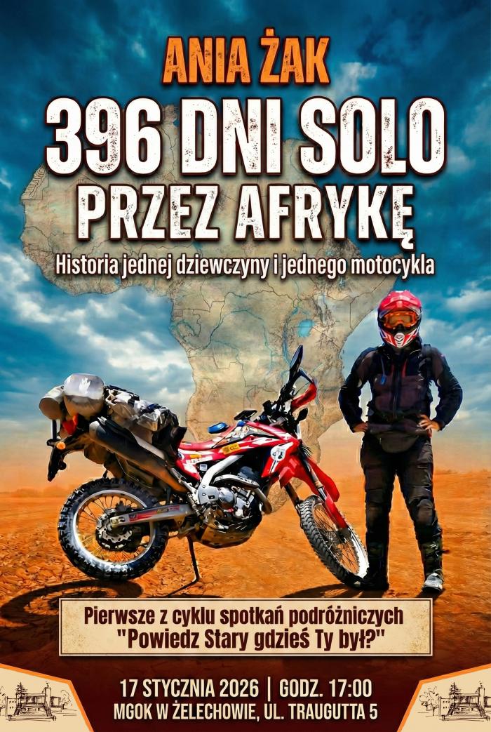 W Żelechowie odbędzie się wyjątkowe spotkanie z Anią Żak, która samotnie przemierzyła Afrykę na motocyklu. Przez 396 dni pokonała 60 tysięcy kilometrów, mierząc się z trudnościami wizowymi, przeprawami i niebezpieczeństwami. Posłuchaj jej historii pełnej odwagi, barw i niezapomnianych przygód.