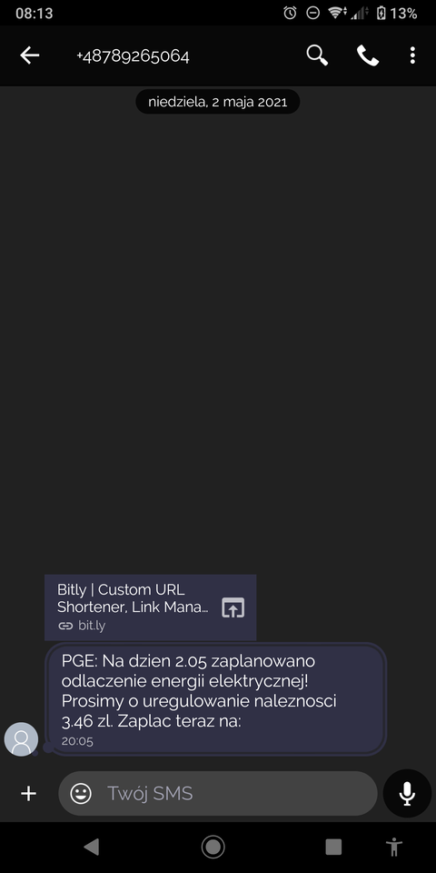 – Przestroga przed oszustwem! Wysyłane są smsy o treści jak ze zdjęcia. Nie płacicie, bo to oszustwo – przestrzega Edyta, która zaznacza, że dostała taką wiadomość, chociaż nie widnieje w bazie użytkowników energii PGE, ponieważ licznik nie jest zapisany na jej imię i nazwisko. – Prosimy naszych Klientów, aby zachowali szczególną ostrożność, ignorowali takie wiadomości i pod żadnym pozorem nie klikali w aktywne linki w nich zawarte. PGE zgłasza przypadki wyłudzeń i oszustw do organów ścigania – informuje PGE Obrót, spółka zajmująca się w Grupie PGE sprzedażą energii do odbiorców końcowych.