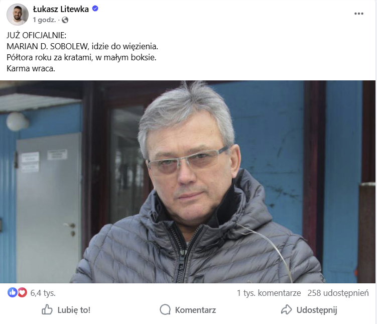 – JUŻ OFICJALNIE: MARIAN D. SOBOLEW, idzie do więzienia. Półtora roku za kratami, w małym boksie. Karma wraca – stwierdził zaangażowany w sprawę parlamentarzysta. Jego post szybko zyskał ponad 6 tys. reakcji i ponad tysiąc komentarzy Internautów zawiedzionych - ich zdaniem- zbyt niskim wymiarem kary.