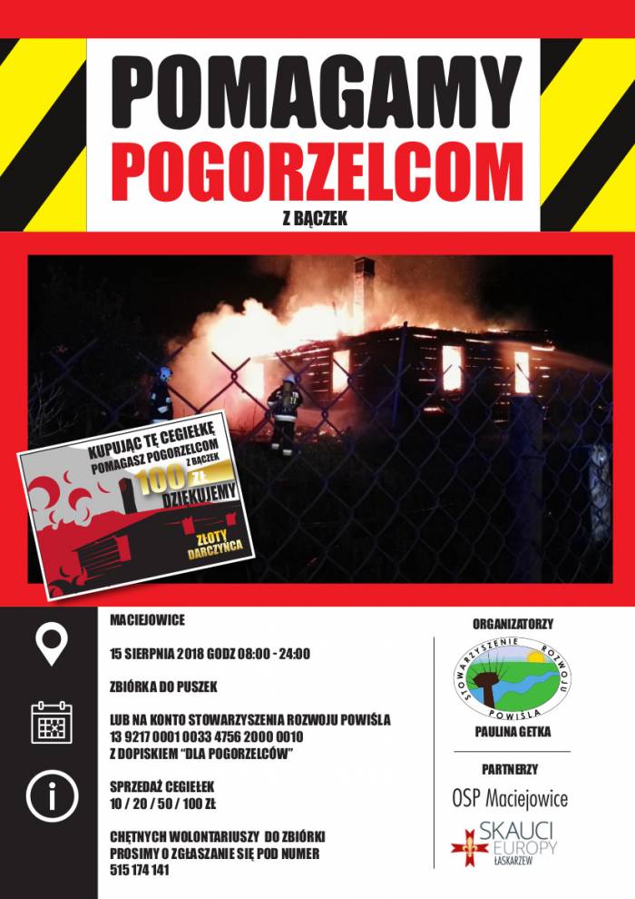 Zbiórka do puszek odbędzie się 15 sierpnia w Maciejowicach. W sprzedaży będą także cegiełki o wartości 10 zł, 20 zł, 50 zł i 100 zł. Pieniądze dla pogorzelców można również wpłacać na konto Stowarzyszenia Rozwoju Powiśla (dane na plakacie). W tytule przelewu należy wpisać "Pomoc dla pogorzelców”.