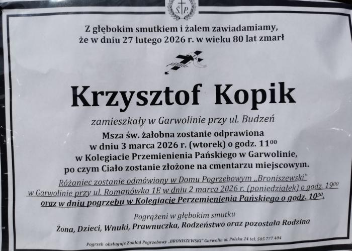 W wieku 80 lat zmarł Krzysztof Kopik, nauczyciel praktycznej nauki zawodu w Zespole Szkół nr 2 w Garwolinie. Informujemy o szczegółach pogrzebu.