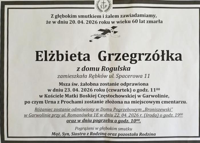 Uroczystości pogrzebowe śp. Elżbiety Grzegrzółki rozpoczną się w czwartek, 23 kwietnia 2026 roku. Msza święta żałobna zostanie odprawiona o godzinie 11:00 w Kościele Matki Boskiej Częstochowskiej w Garwolinie, po której nastąpi złożenie urny z prochami na miejscowym cmentarzu.