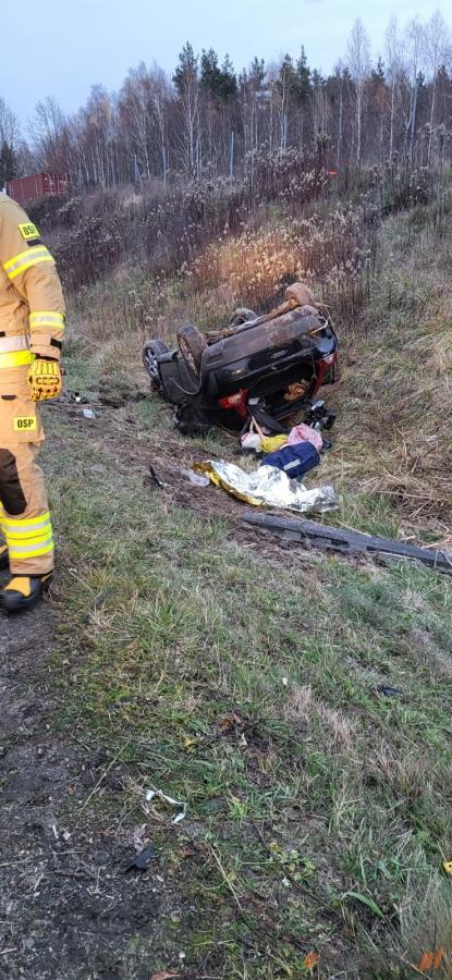 Zdjęcia Dwie osoby w szpitalu po dachowaniu samochodu - fotorelacja
