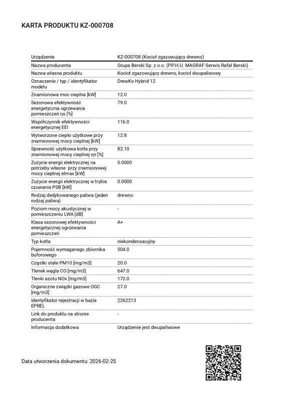 Dane techniczne – model 12 kW