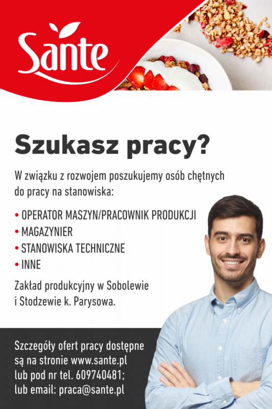 Obecnie w związku z rozwojem do zakładu produkcyjnego SANTE w Sobolewie i Stodzewie k. Parysowa poszukujemy osób chętnych do pracy na stanowiska: