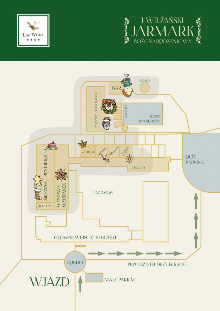 Organizatorzy zachęcają gości do pozostawienia samochodów na dużym parkingu. Do namiotów i stoisk Jarmarku można stamtąd przejść wzdłuż terenów hotelowych. Szczegóły znajdziecie na poniższej mapce.