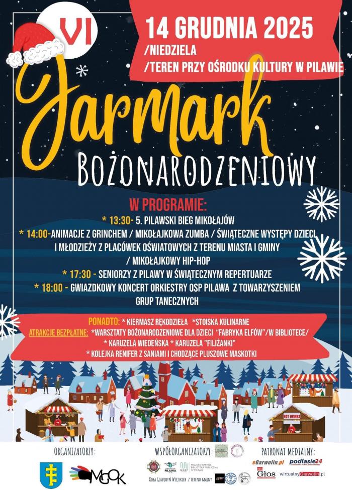 Władze Miasta i Gminy Pilawa zapraszają wszystkich mieszkańców oraz gości do wspólnej zabawy. VI Jarmark Bożonarodzeniowy to nie tylko zakupy, ale przede wszystkim bogaty program artystyczny i atrakcje dla najmłodszych. Impreza odbędzie się na placu przy Ośrodku Kultury.